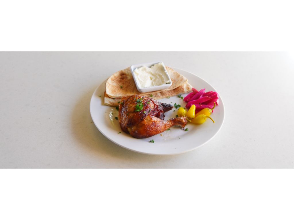 Seasoned, Slow Roasted, 1/4 Rotisserie Chicken Thigh. Served with Rice, Fatoush Salad, Hummus, Pickled Turnips, Pita Bread & Garlic Spread.