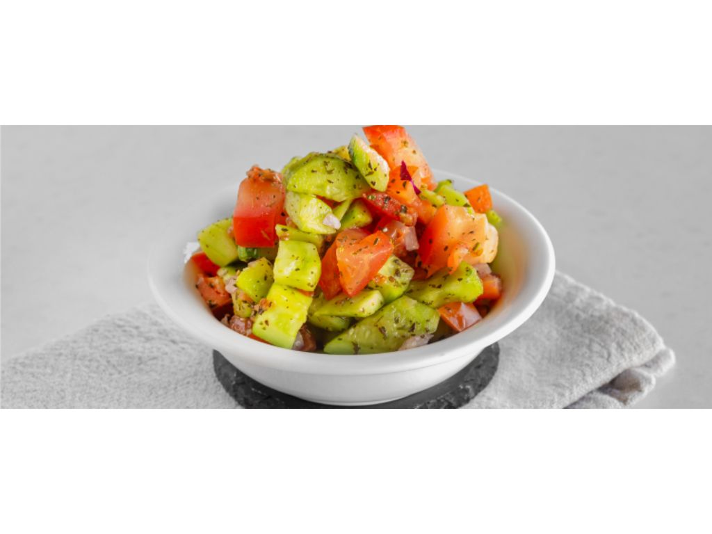 Tomato, Cucumber, Red Onion, Tomato, Mint, Lemon, Extra Virgin Olive Oil.