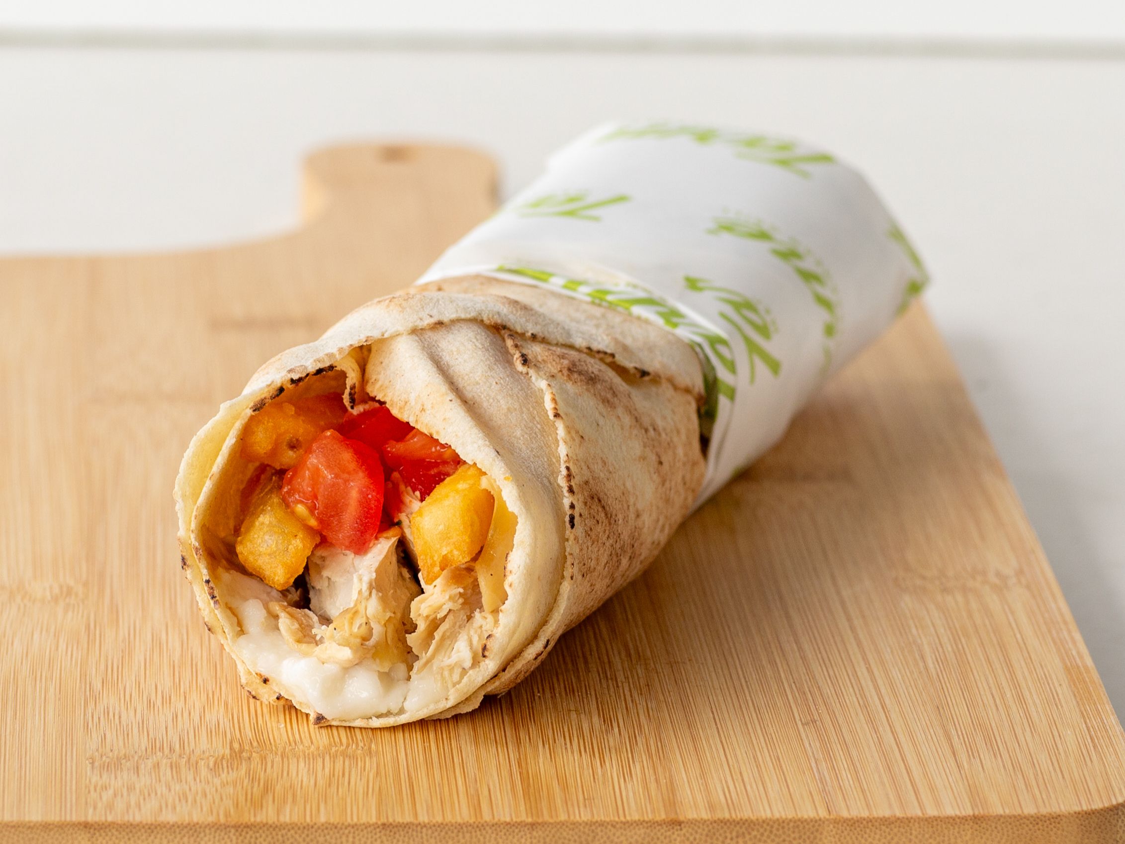 Hormone Free, Flame-Grilled Chicken Breast, Tomato, Fries, House Spread, Garlic Sauce.