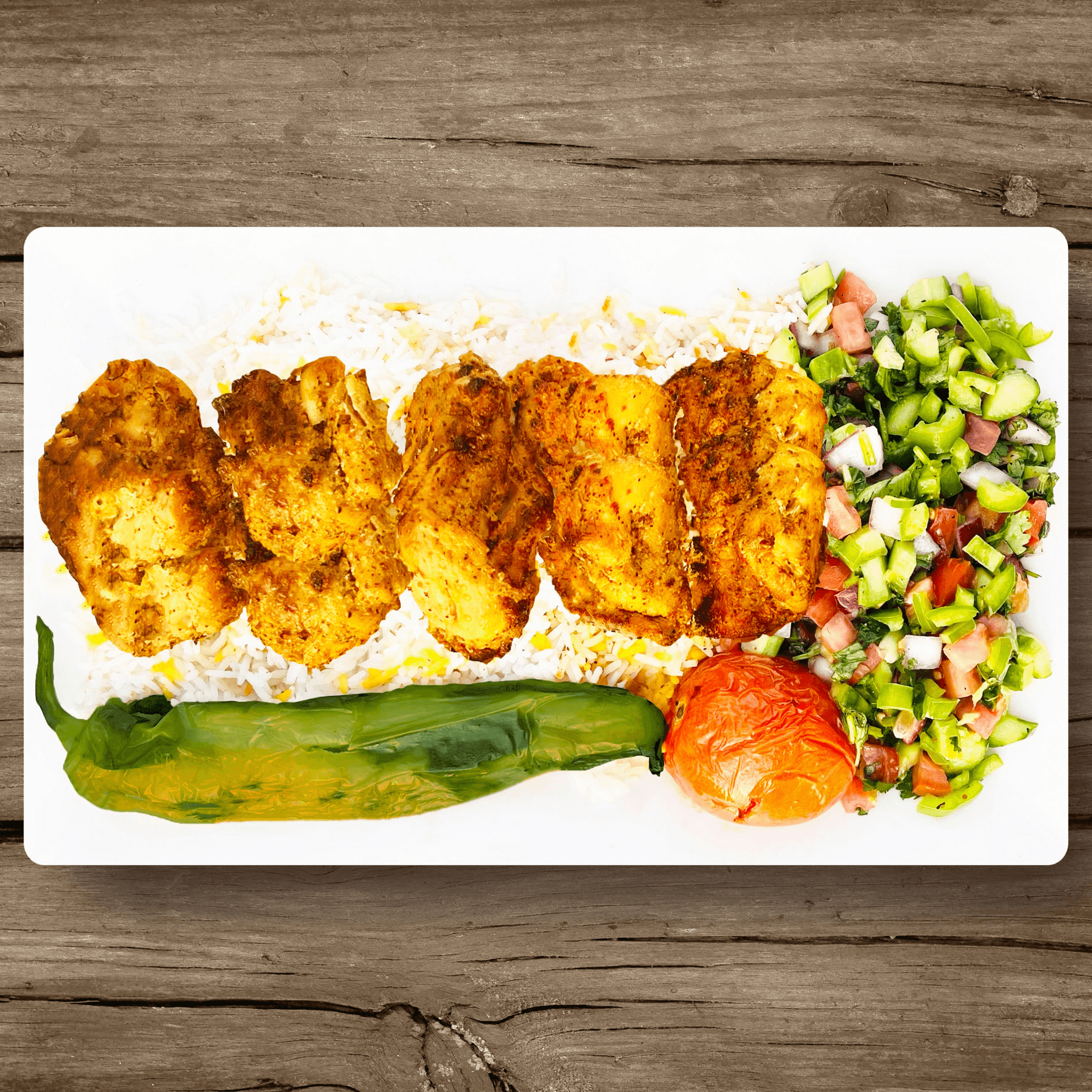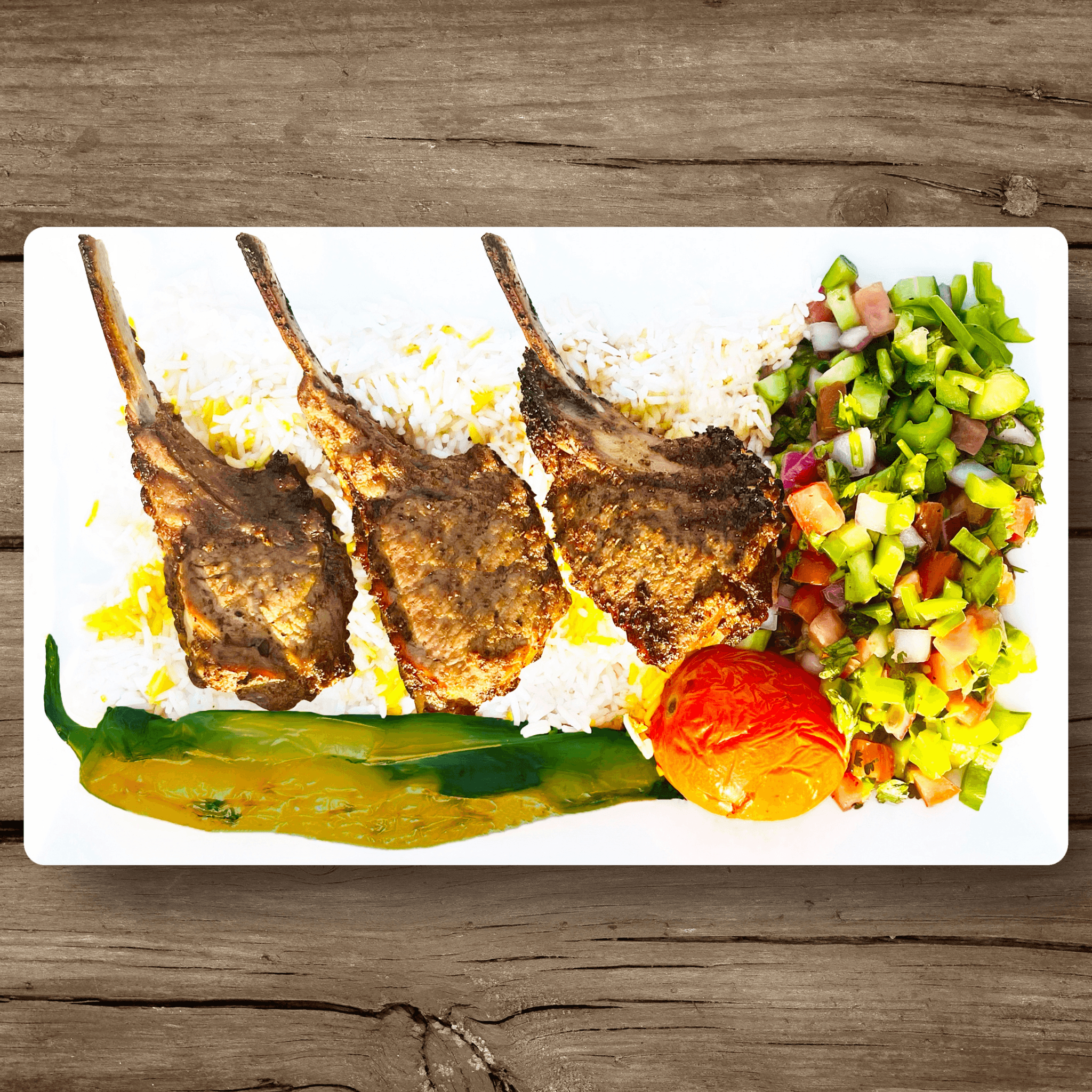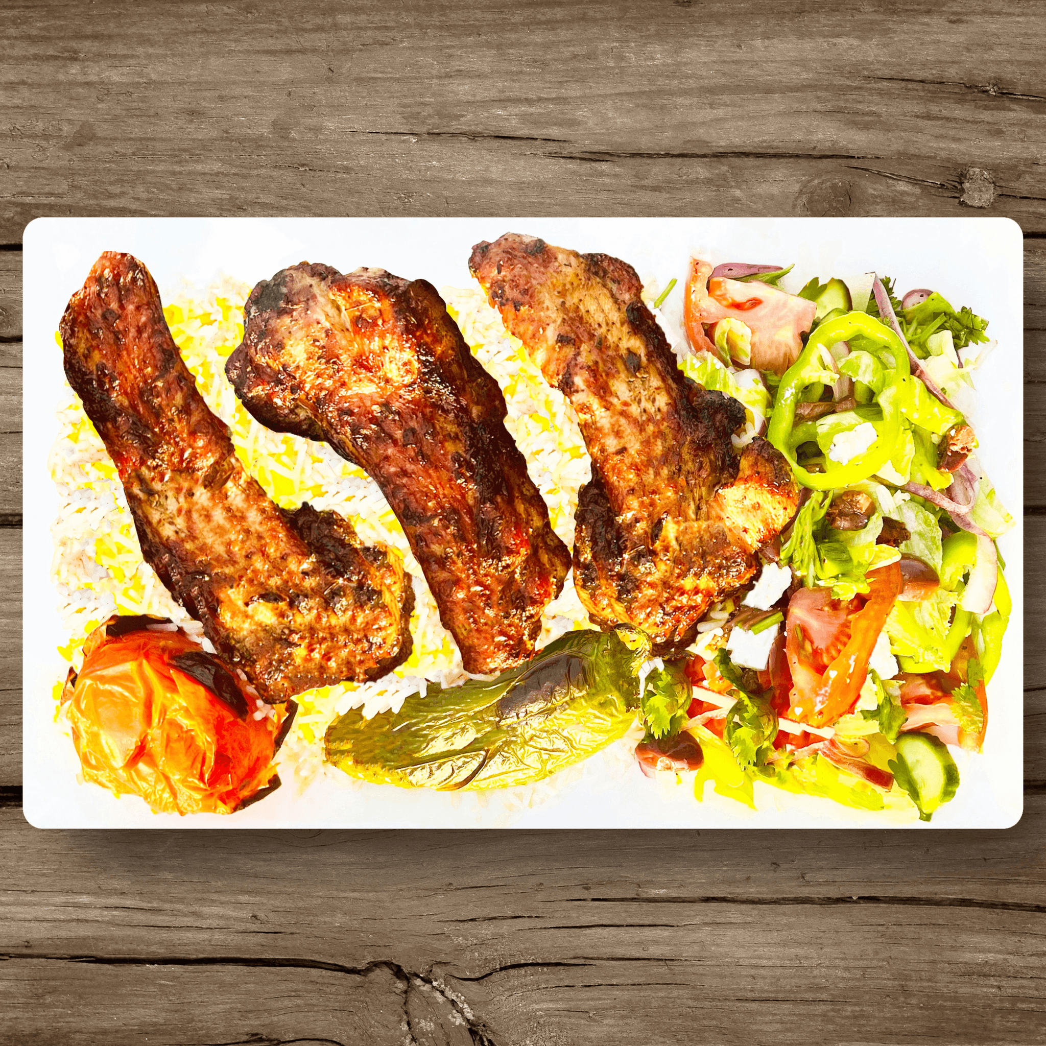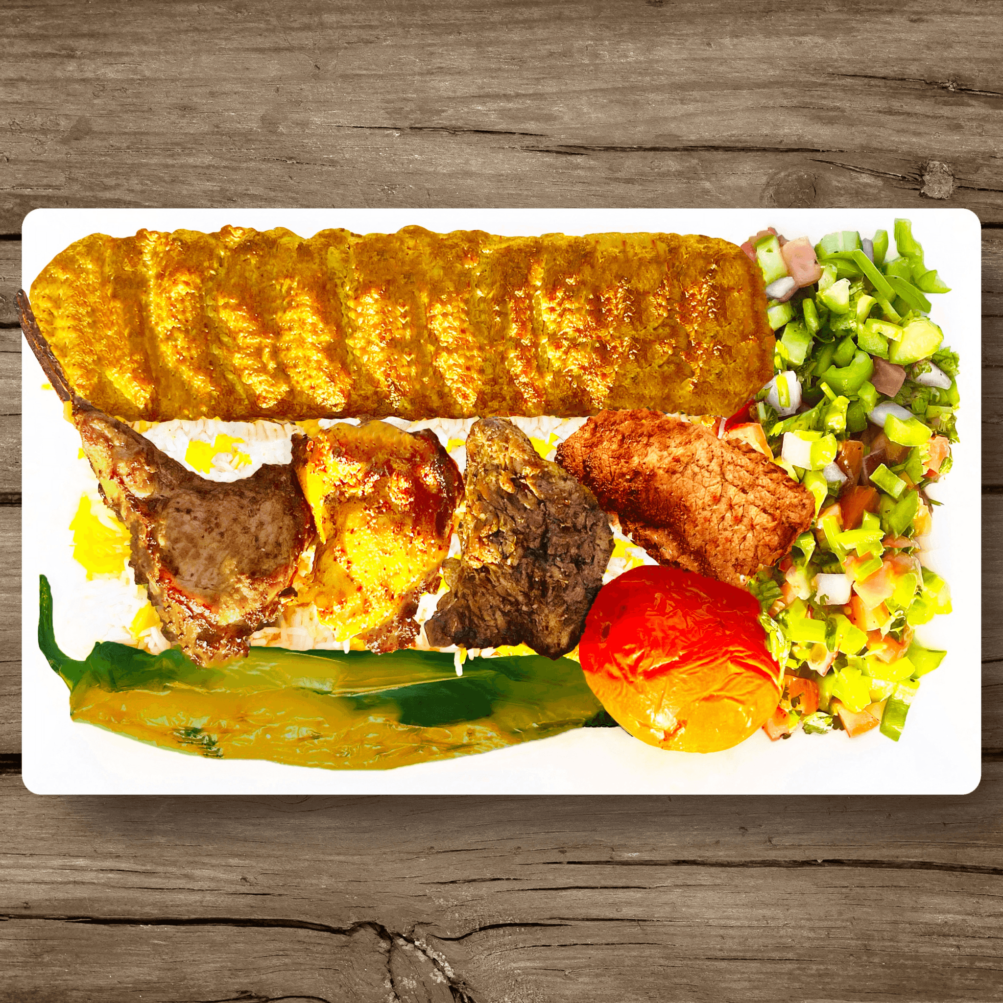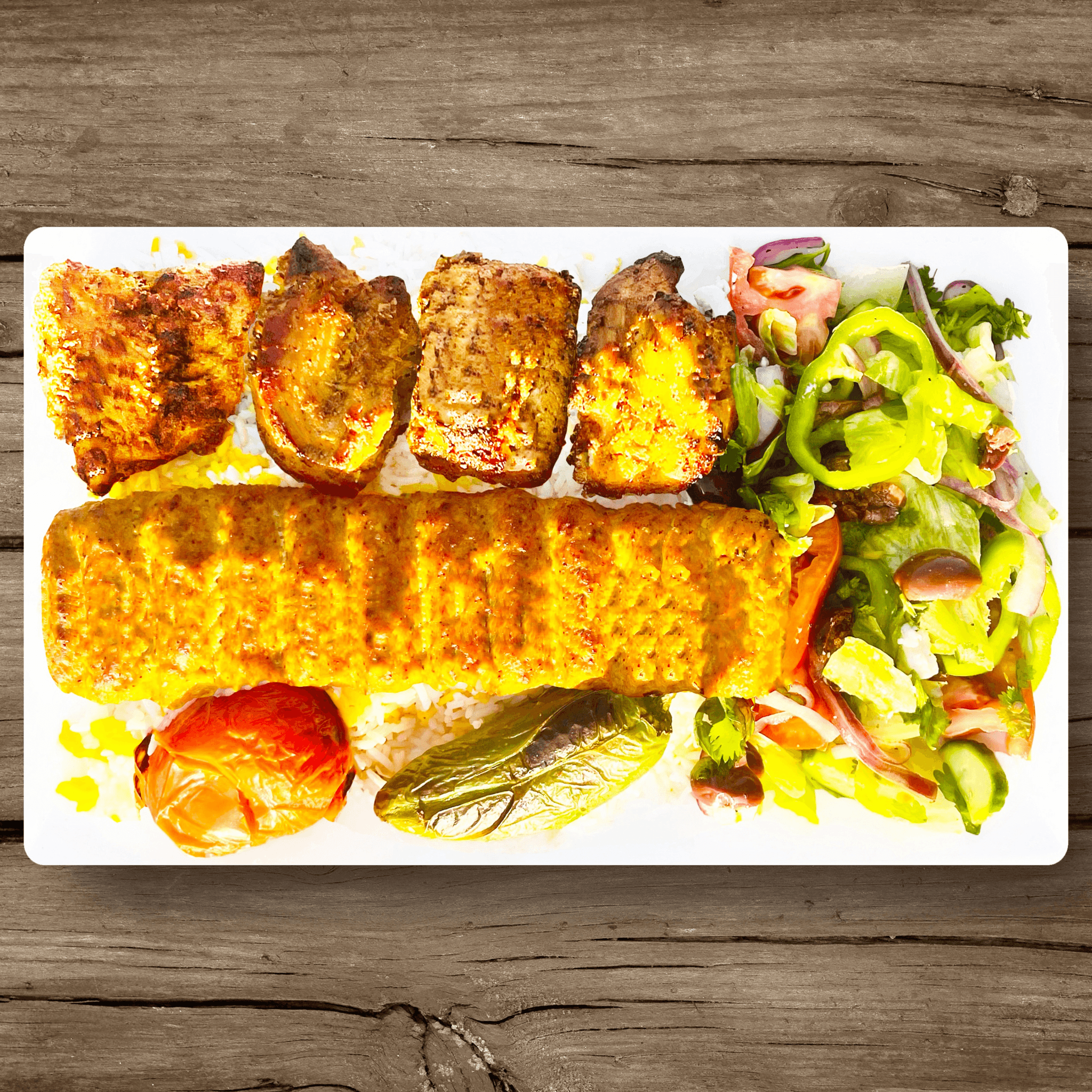 Grilled lamb chops, filet mignon, chicken luleh kabob, pork and chicken shish kabobs served over a bed of fluffy basmati rice, accompanied by a fresh cucumber and tomato salad, charred tomato, grilled pepper, and warm pita bread