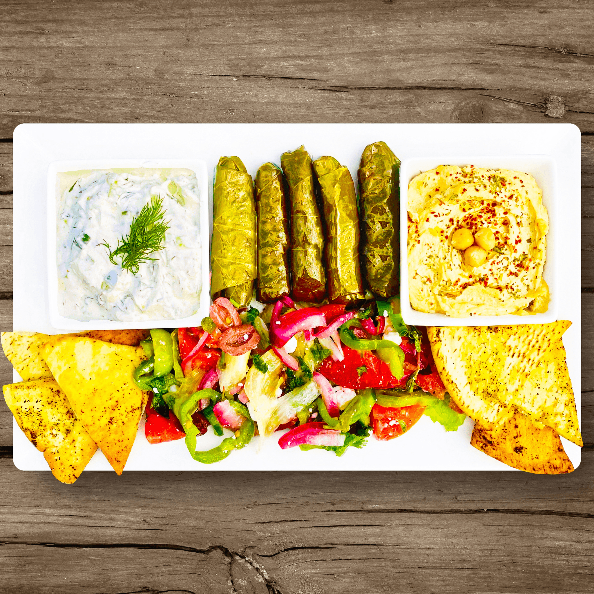A variety of stuffed grape leaves served with lemon slices, house-made hummus spread with chickpeas, creamy tzatziki sauce, fresh cucumber and tomato salad, and warm pita bread